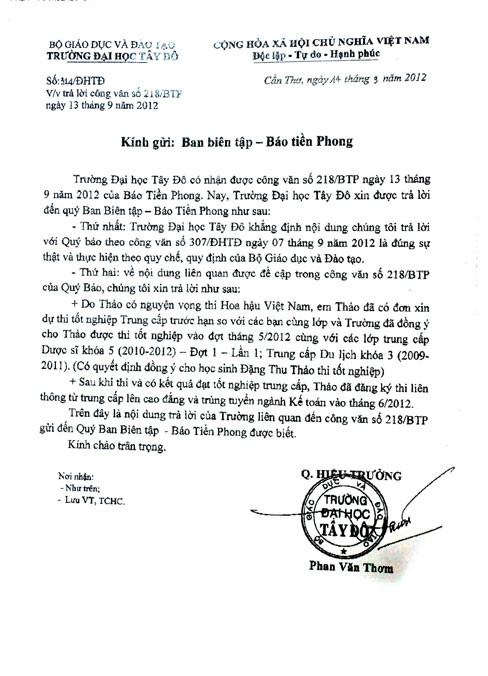 Để rộng đường dư luận và khẳng định một lần nữa những thông tin do trường ĐH Tây Đô cung cấp, báo Tiền Phong đã gửi công văn lần thứ hai cho trường ĐH Tây Đô để xác minh.