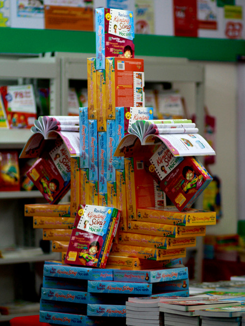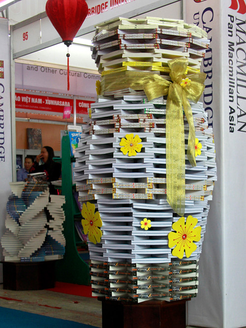 | Tại các khu trưng bày, sách đều được xếp thành những hình khối khác nhau. Trong ảnh là công trình của gian hàng sách của Công ty Cổ phần Tiền Phong. |