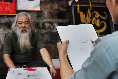 Một ông đồ đang thuê người vẽ kí họa chân dung của mình.