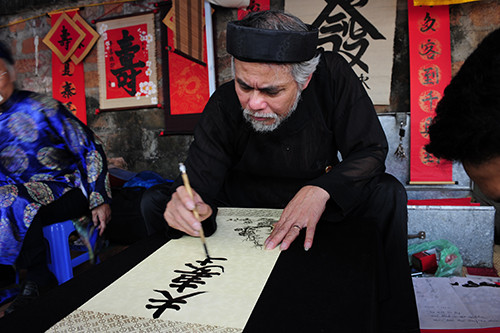 Cả ông đồ lẫn khách trao đổi với nhau về thư pháp