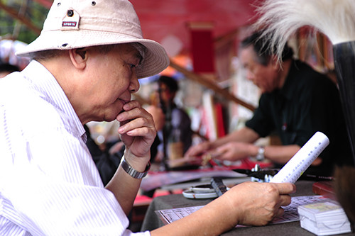 Một 'thư khách' đang nghiền ngẫm các vế đối trước khi xin chữ.