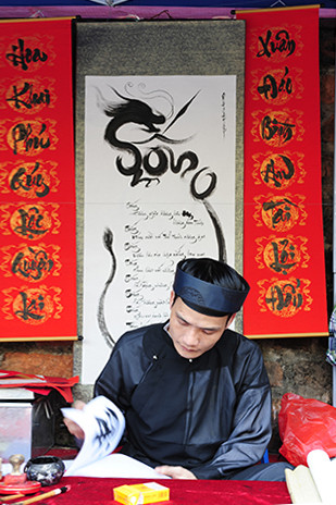 Một ông đồ đang suy tư, nghiên cứu những nét viết trong nghệ thuật thư pháp.