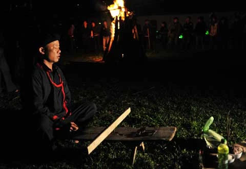 Sau đó, họ ngã vật ra bãi cỏ và lại quây quanh thầy cúng, gõ vào chiếc đàn sắt để thần linh nhập vào.