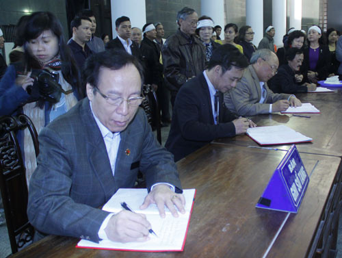 | Các nghệ sĩ viết lời chia buồn trong sổ tang. |