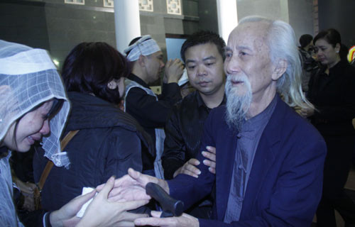 | Nhạc sĩ Phú Quang rớm lệ trước linh cữu nghệ sĩ Văn Hiệp. |