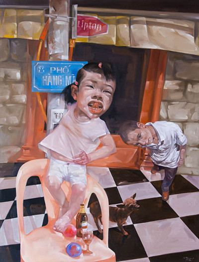 Họa sĩ tâm sự: “Tôi thể hiện các nhân vật với những nét châm biếm đặc trưng hài hước đến lố bịch trong tranh để cá nhân hóa một cuộc sống điển hình của bất kì người Việt Nam nào trong xã hội hiện tại”.