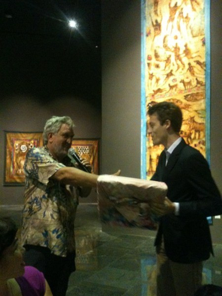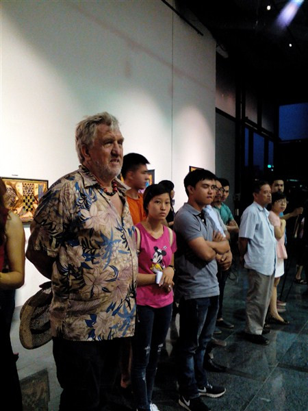 Eric trao tặng một tác phẩm của ông cho Đại diện ĐSQ Hà Lan tại Hà Nội hôm khai mạc 20/6. Ảnh: H.T