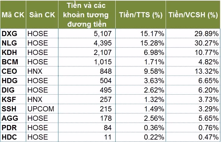 | Top DN BDS có Tiền và tương đương tiền nổi bật trong kỳ. Nguồn dữ liệu: BCTC các DN BDS |