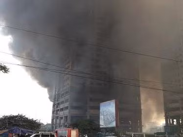 Ngọn lửa bùng lên rất nhanh, khói cuộn ngùn ngụt, bao trọn cả tòa nhà đang thi công. Hàng loạt công nhân trong tòa nhà hoảng loạn tháo chạy.