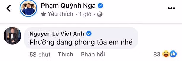 Chẳng hạn như mới đây, Quỳnh Nga đăng ảnh xinh đẹp với lời ngọt ngào “Chiều nay có trận mưa rào. Anh cho em hỏi lối vào tim anh?". Đâu có ngờ, Việt Anh đã chặn lại mọi "lối", khi bình luận "Phường đang phong toả em nhé", như muốn nói rằng Quỳnh Nga là “hoa đã có chủ”.
