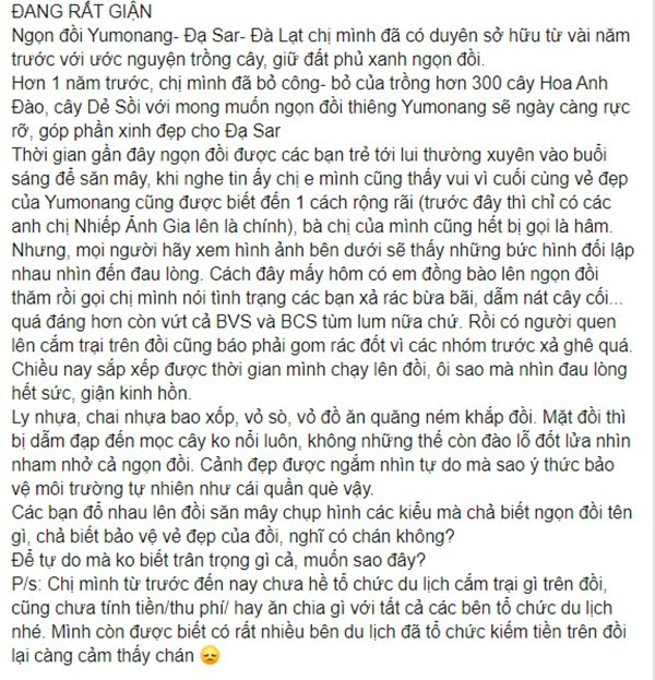 Câu chuyện lên tới đỉnh điểm vào chiều 23/5 khi một đoàn khách kéo lên đồi chụp ảnh. Chị nhắc nhở họ về việc giữ gìn vệ sinh nhưng kết quả là đoàn khách này vẫn vứt chai nước, khăn giấy bừa bãi. Nhận thấy tình hình khó kiểm soát, chủ đồi Yumonang quyết định thông báo đóng cửa ngọn đồi vào 24/5.