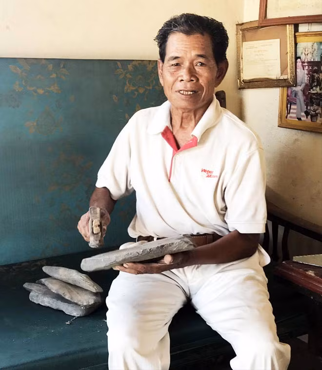 Thấy tôi mân mê thanh đàn đá, già Y Wan liền lấy chiếc búa nhỏ ra gõ khiến những âm thanh du dương giàu nhạc tính vang lên thánh thót. Già nói mỗi bộ đàn đá được làm bằng các thanh đá với kích thước dài, ngắn, dày, mỏng khác nhau. Với những thanh dài, to và dày thì âm thanh phát ra nghe trầm trầm trong khi các thanh đá ngắn, nhỏ và mỏng thì tiếng rất thanh.