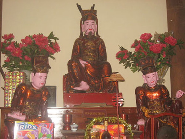 Ở ban thờ này có tới 3 vị Đức Ông, trong đó, tượng Đức Ông to hơn, ngồi cao hơn một bậc, ở phía dưới có hai tượng ngồi. Pho tượng Đức Ông ngồi trên lại đội mũ xung thiên, một chân để trong hài một chân để ở ngoài dáng vẻ rất thoải mái. Ngài mặc áo ngoài có thêu rồng ẩn trong mây, lưng thắt đai trông rất oai nghiêm. Đây là điều hiếm thấy trong các pho tượng thờ Đức Ông ở các ngôi chùa khác. Cho đến ngày nay, cũng không ai biết được chùa được xây dựng từ thời nào.