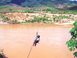 Người dân ở đây cho biết, để có được đường dây cáp treo này, họ đã phải bỏ tiền làm hai đường dây cáp chạy song song, một dây đi và một dây về với cách đấu nối 2 đầu cọc rất đơn giản: bên này cao thì bên kia thấp, nên khi lắp ròng rọc vào nó tự động chạy tuột sang bên kia bờ. Không chỉ nông lâm sản, người lớn được đưa đi - về bằng cách này, mà hầu hết trẻ em bên kia sông cũng phải chấp nhận mạo hiểm đu theo dây cáp để đến trường mỗi ngày.