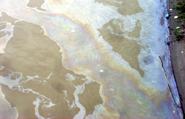 | Dầu nổi trên sông Hồng. Ảnh: T.D |