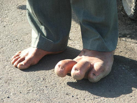 | Do bàn chân khổng lồ, không thể dép guốc nào vừa nên từ nhỏ đến nay anh Tài chỉ đi chân đất. |