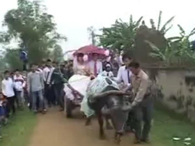 Thay vì rước dâu bằng xe hơi hay dàn xe siêu sang, chàng rể muốn tìm cảm giác lạ cho ngày cưới bằng cách đón dâu bằng xe trâu. Chú trâu đen khoác tấm vải màn trắng, dán chữ song hỉ...