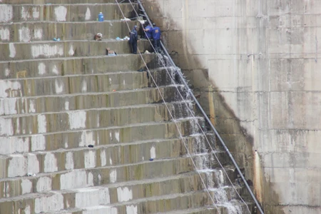 Ngay tại tuyến đường phía dưới dẫn vào cửa xả thân đập, một hệ thống hàng rào đã được dựng lên với tấm biển: “Cấm vào”. Ngay tại cổng một công nhân ra sức ngăn cản không cho vào. Để tiếp cận hiện trường, chúng tôi phải đi từ thân đập cao hơn 70m theo các bậc xuống phía dưới.