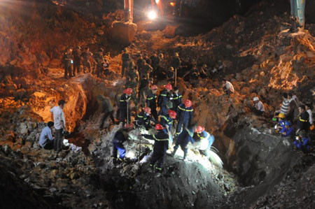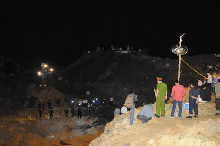 Đến 22h, một tiểu đội mang chăn màn, chiếu vào các lán dựng tạm. Bên ngoài khu vực sạt lở, khoảng trăm người vẫn đang xúm quanh khu vực được nhận định là vị trí bốn người nhà bà Nguyễn Thị Hoàn (49 tuổi) đang bị vùi lấp.