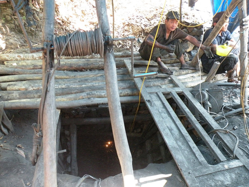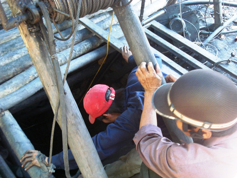 | Xuống hầm than sâu hơn 40m tìm kiếm hai nạn nhân. Ảnh: Nguyễn Thành. |
