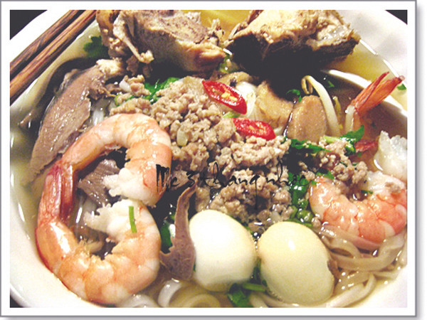 Một tô hủ tiếu hay mì chỉ được múc chừng 1/3 vá to thịt nạc bằm ướp kỹ vào một cái tô cạn đáy. Sau đó múc gần một vá nước lèo thật nóng đã nấu bằng xương heo, khô mực, tôm khô đổ vào tô rồi dùng vá đập nhè nhẹ để thịt bằm rời ra và vừa mới chín tới ăn mới ngọt.