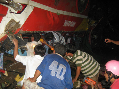 Việc cứu hộ trở nên khó khăn khi rất nhiều nạn nhân còn bị kẹt sâu trong chiếc xe bị bẹp dúm, một nửa xe bị ngập nước, trời lại tối.