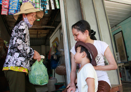 Lúc rảnh chị lại phụ bán hàng tạp hóa nhỏ cho mẹ đẻ. Người dân địa phương ghé quán thường hỏi thăm, động viên.