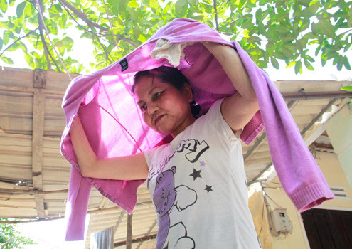 Được bác sĩ khuyến cáo tránh để mặt tiếp xúc trực tiếp với ánh sáng mặt trời nên mỗi lần đi lại từ nhà trên xuống nhà dưới chị phải đội nón kín hoặc dùng áo che.