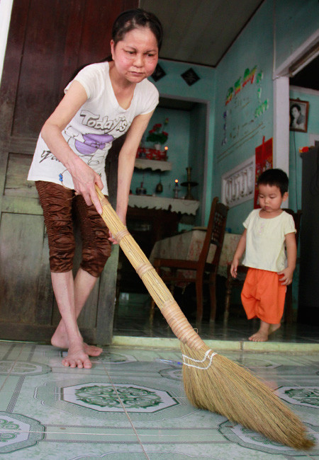 Tuy sức khỏe còn yếu nhưng chị Mai đã có thể làm được một số công việc nhẹ như quét nhà, dọn dẹp nhà cửa...