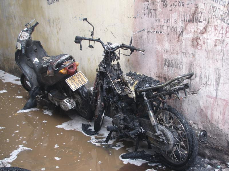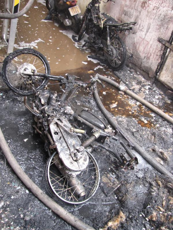 Theo quan sát tại hiện trường, toàn bộ hệ thống siêu thị BiboMart bốn tầng bị thiêu rụi. Ba xe máy để dưới siêu thị bị thiêu cháy.