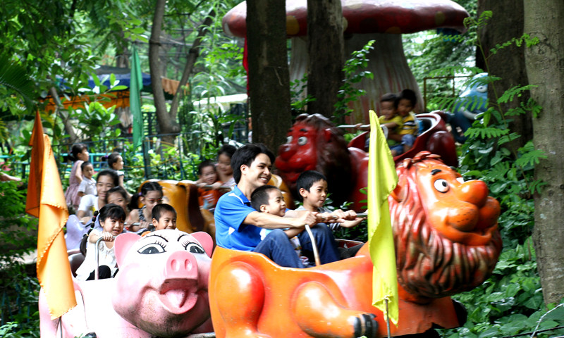 | Công viên Thủ Lệ đông nghịt người dân đưa các bé đi chơi trong ngày 1-6. |