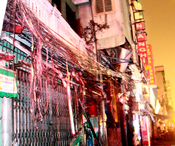 | Ngọn lửa thiêu rụi đường dây điện căng qua ba tòa nhà. |