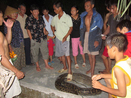 Sau khi nghe tin anh Học bắt được trăn nặng hơn 35kg, rất đông người dân trong xã đã kéo đến xem.