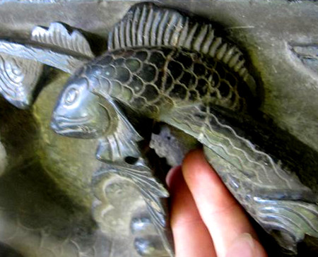 Thắp hương khấn vái xong, ông Thanh lần tay dọc 4 chiếc cột đá xanh chạm khắc rồng phượng tuyệt đẹp và chỉ tôi hình thù những con cá. Tôi nhìn kỹ, thì đúng là hình những con cá rô rất sinh động, có kích cỡ tương đương cá thật.