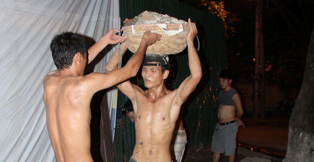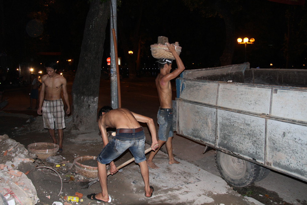 TPO - 22hh 30, xe tải dừng lại bên vệ đường. Ba thanh niên cởi trần trùng trục mang xẻng, cuốc, thúng ập vào đống phế thải trên vỉa hè. Đêm làm việc của những người đội phế thải thuê ở Hà Nội bắt đầu.