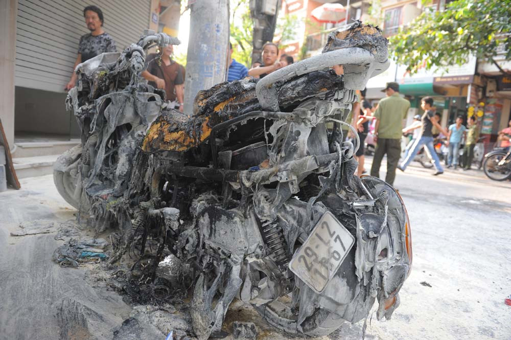 TPO – Khoảng 16h30 ngày 22-8, chiếc xe Yamaha mang BKS 29L2-1067 đang dựng trên phố Hàng Mành (Hoàn Kiếm, Hà Nội) do đổ xăng bất cẩn đã bốc cháy dữ dội.