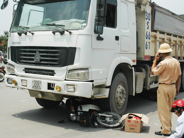 Tại hiện trường, chiếc xe tải nằm ngay vòng xuyến trung tâm, khiến các phương tiện di chuyển qua đây gặp nhiều khó khăn. Chiếc xe máy nằm gọn dưới gầm xe tải, hư hỏng nhiều bộ phận.