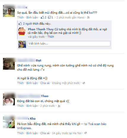 Vào khoảng 10h25' nhiều người dân tại Hà Nội cho biết họ cảm thấy rung chấn nhẹ. Ngay lập tức trên facebook nhiều thành viên chia sẻ thông tin "động đất".