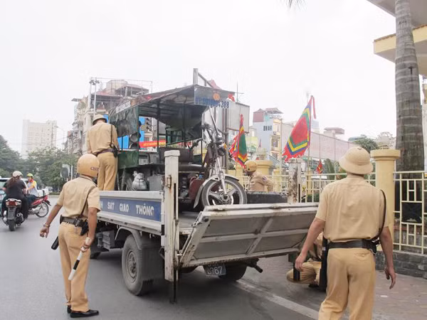 | Lực lượng CSGT ra quân xử phạt xe ba bánh giả danh thương binh ngày 16-10. |