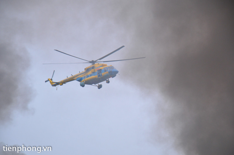 Trực thăng thuộc lực lượng phòng không được triển khai trong điều kiện thời tiết không thuận lợi. Trời có mây mù và có mưa nhỏ khiến công tác tìm kiếm trở nên khó khăn hơn. Ảnh: Công Khanh