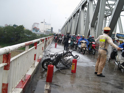 > Xe máy đang chạy bốc cháy dữ dội trên cầu