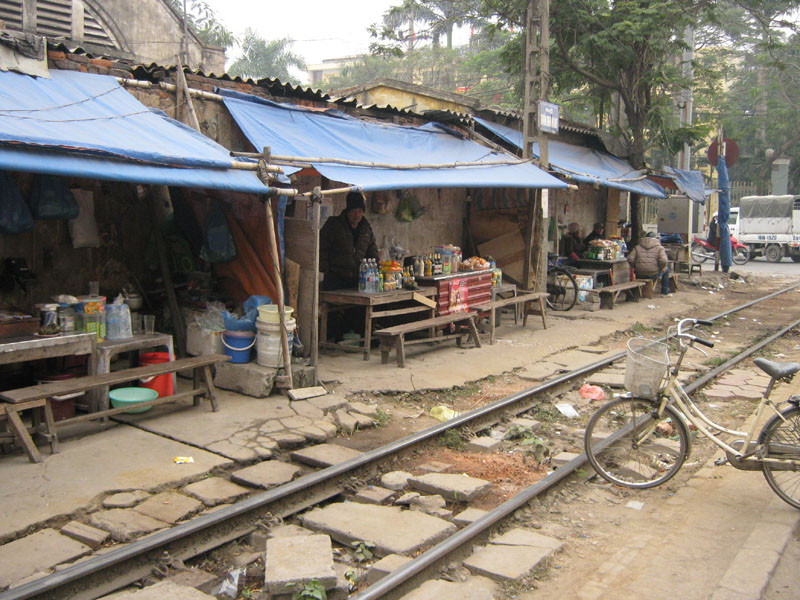 | Người dân vô tư kinh doanh ngay hành lang đường sắt. |