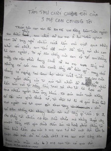 Chị Phương cũng viết trong thư rằng, thật sự chị không muốn ly dị nhưng tại chồng sống quá lạnh nhạt lại còn nhiều lần đuổi chị ra khỏi nhà. Cũng vì hai con mà chị sống tới hôm nay. Do không chịu nổi cảnh sống như thế bên chồng nên chị yêu cầu ly dị và muốn mang theo một đứa con, chỉ cần mẹ con sống bên nhau, không cần tài sản, nhưng chồng chị không đồng ý. “... Vậy thì 3 mẹ con cùng chết, tôi chết rồi, mọi người cố sống đừng có hiểu lầm cho nhau”, những lời trong thư đau xé lòng của chị Phương.