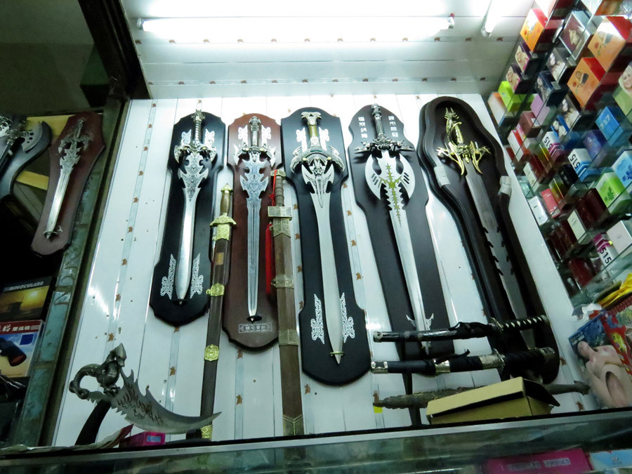 Những hàng vũ khí khác cũng được treo đầy trên sạp, nhưng không có khách hỏi. Ế ẩm, thành ra, những tay buôn súng ở đây sẵn sàng hạ giá.