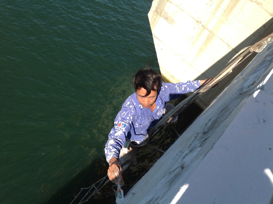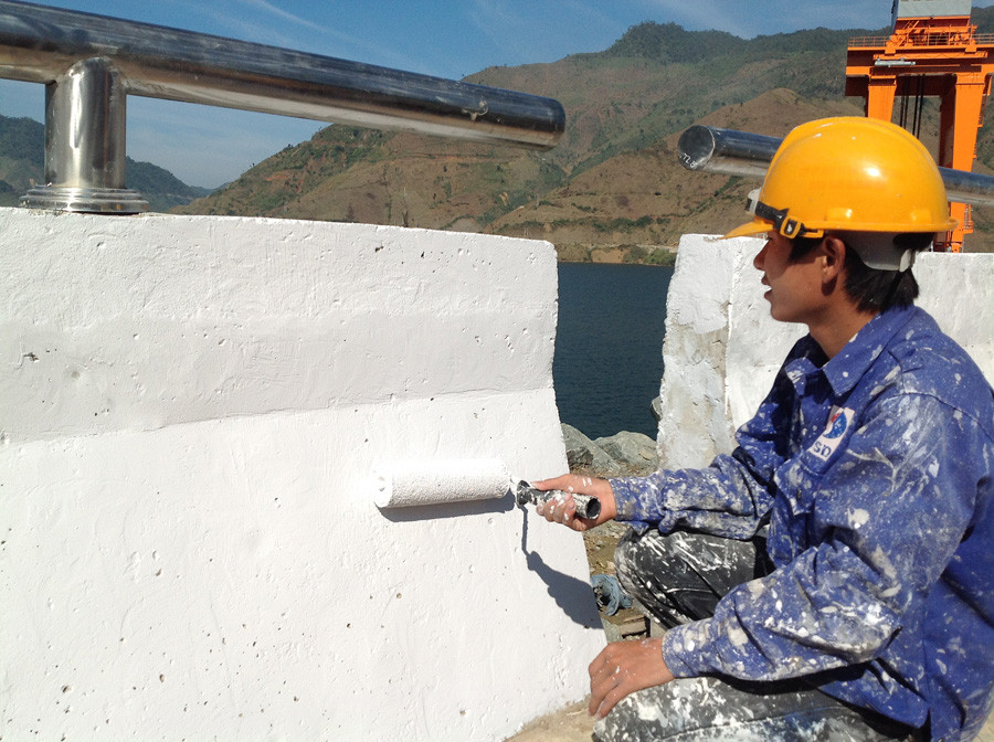 Công nhân đang hoàn thiện hạng mục cuối cùng là quét sơn lên thành đập. Ảnh: Phong Cầm.