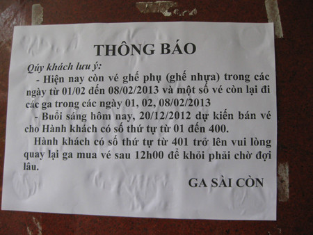 Theo ghi nhận của PV, do số lượng vé tàu tết đi vào những ngày cao điểm còn ít và hạn chế khách đổ dồn về nhà ga quá lớn không giải quyết xuể, ngày 20.12, nhà ga chỉ phát tổng cộng 1.830 số thứ tự (800 số lấy qua tin nhắn điện thoại). Đồng thời, nhà ga cũng thông báo thời gian phục vụ các số thứ tự, cụ thể: Trong buổi sáng nhà ga phục vụ bán cho những hành khách có số thứ tự đến số 400, với hành khách số tự 401 trở lên ga thông báo sau 12 giờ trưa quay lại ga để mua vé.