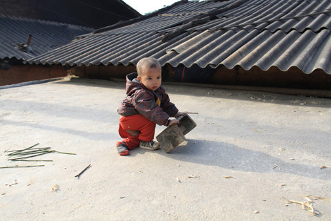 Không có trò chơi, chiều tối, lũ trẻ gần chợ Sà Phìn (xã Sà Phìn, Đồng Văn, Hà Giang) rủ nhau buộc một chiếc võng, lần lượt từng bé ngồi lên võng để bạn đung đưa. Chiếc võng là là mặt đất, sát ngay tảng đá hộc. Ảnh: Trường Phong.