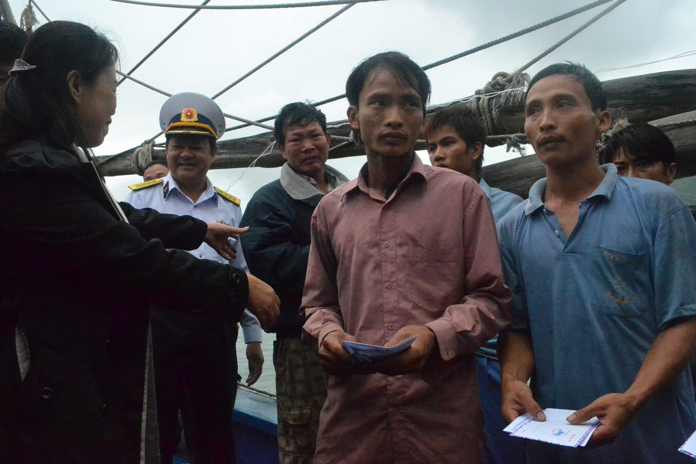 Tàu cập bờ, dù biết an toàn, nhưng trên khuôn mặt của bảy ngư dân vẫn còn biểu lộ sợ hãi vì gặp nạn.