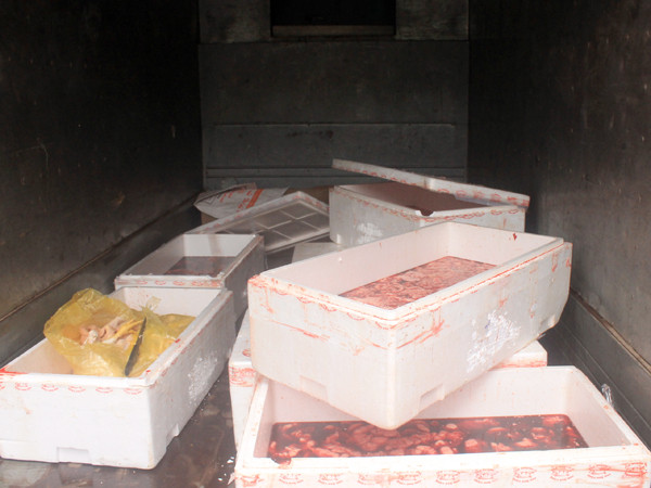 | Số lòng lợn, thịt gà ngâm hóa chất có nguốn gốc Trung Quốc trên xe tải bị phát hiện. |