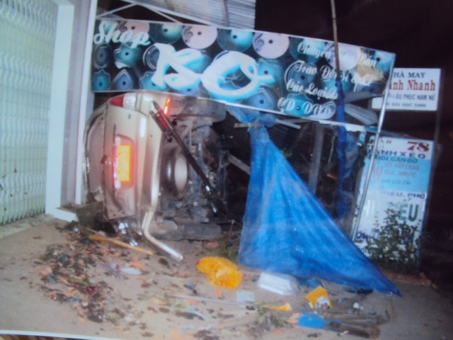 Sau đó xe Inova do Lâm điều khiển kéo theo xác anh Hoàng và cháu Nhi tiếp tục lao vào tông sập bức tường cùng cửa chính của ngôi nhà bên đường rồi lật ngang.